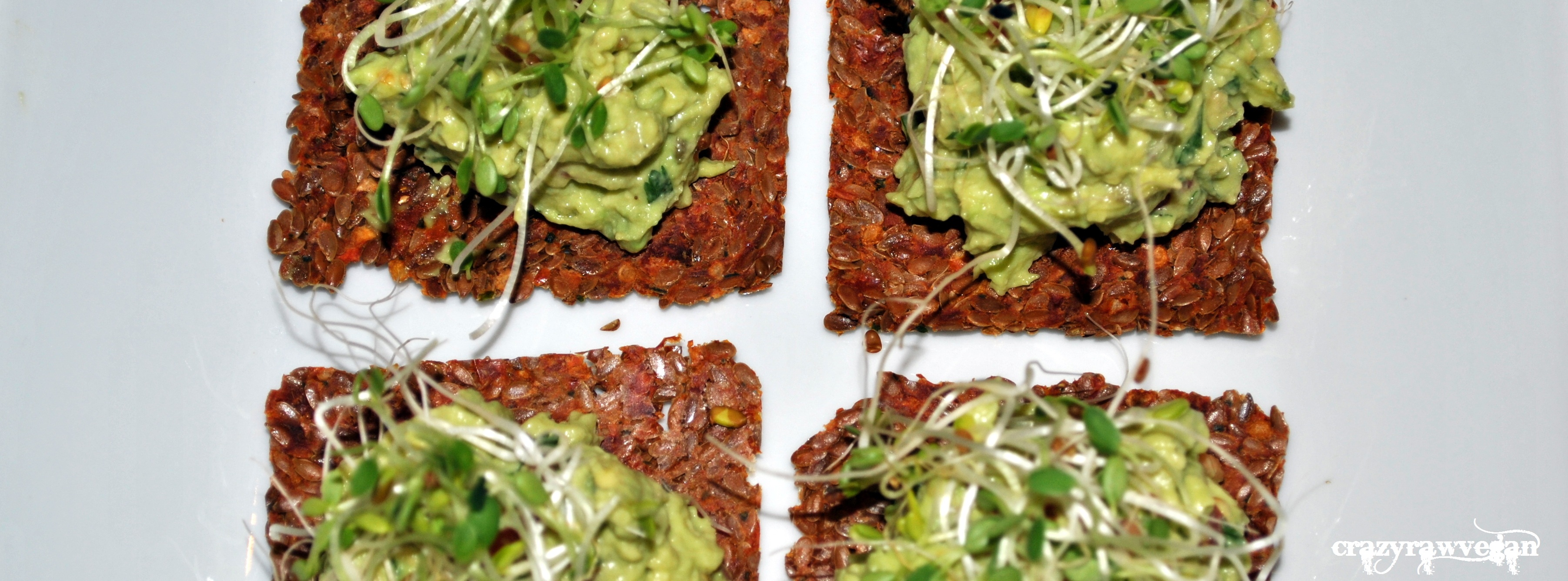 I squished the avocado into a bowl, chopped up the other ingredients, seasoned with the hot sauce, sea salt and black pepper and mooshed it all together with a fork. Put a few dollops on my flax seed crackers, garnished with sprouts (because who doesn’t need to eat more sprouts??) and voilà – lunch!